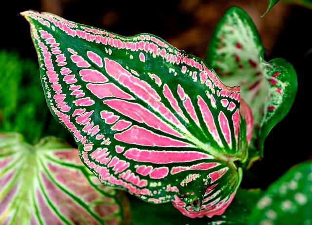 칼라디움은 남미가 원산지인 다년생 식물로, 알록달록한 잎이 특징입니다.